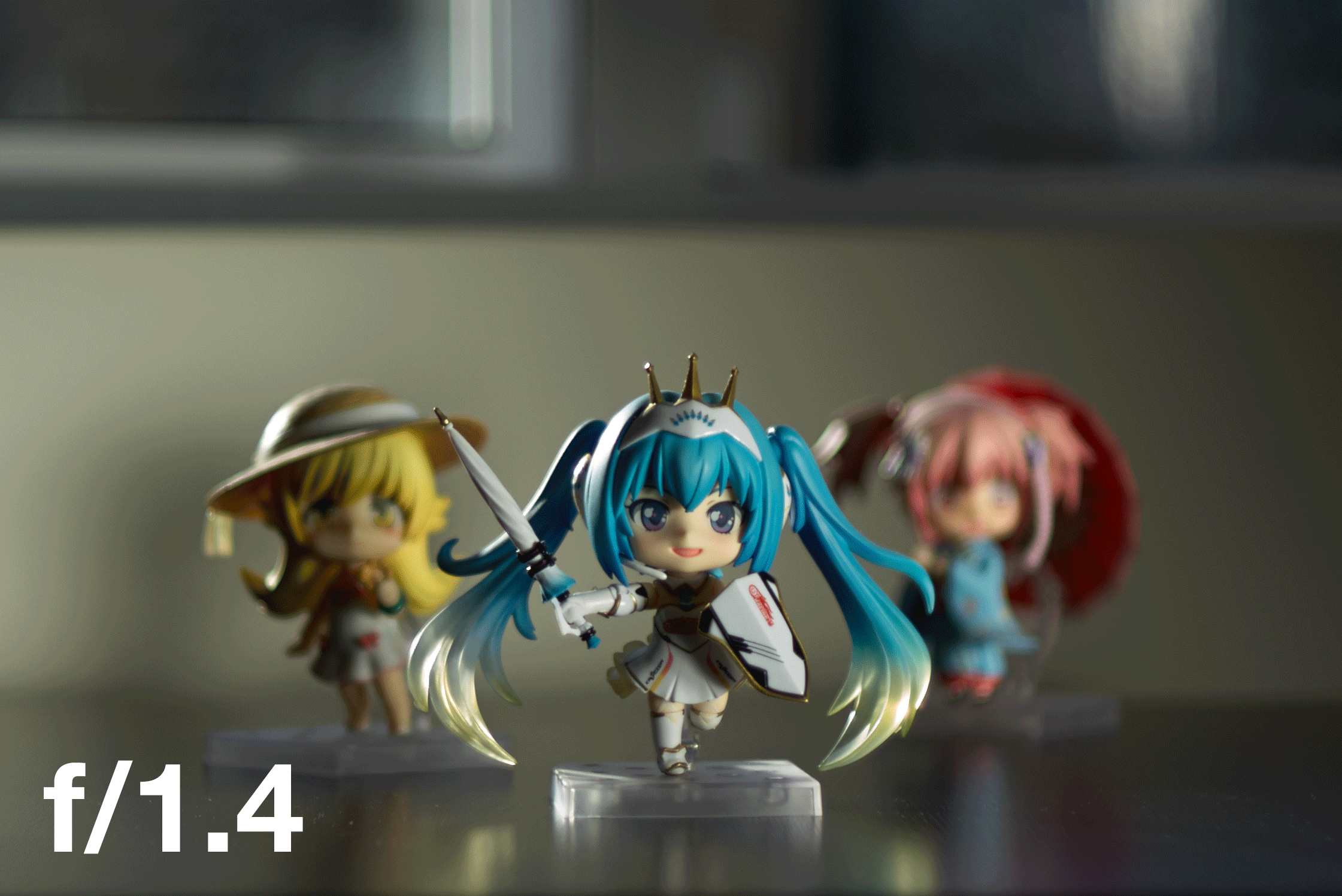 As a test, I used my Leica M on a tripod and focused on the center Nendoroid's eyes using live view approximately 1m away. Live view was used to eliminate any rangefinder calibration problems with the camera. When changing the aperture ring, I applied enough pressure on the focus nub so that the aperture ring could be turned without affecting the barrel of the lens.